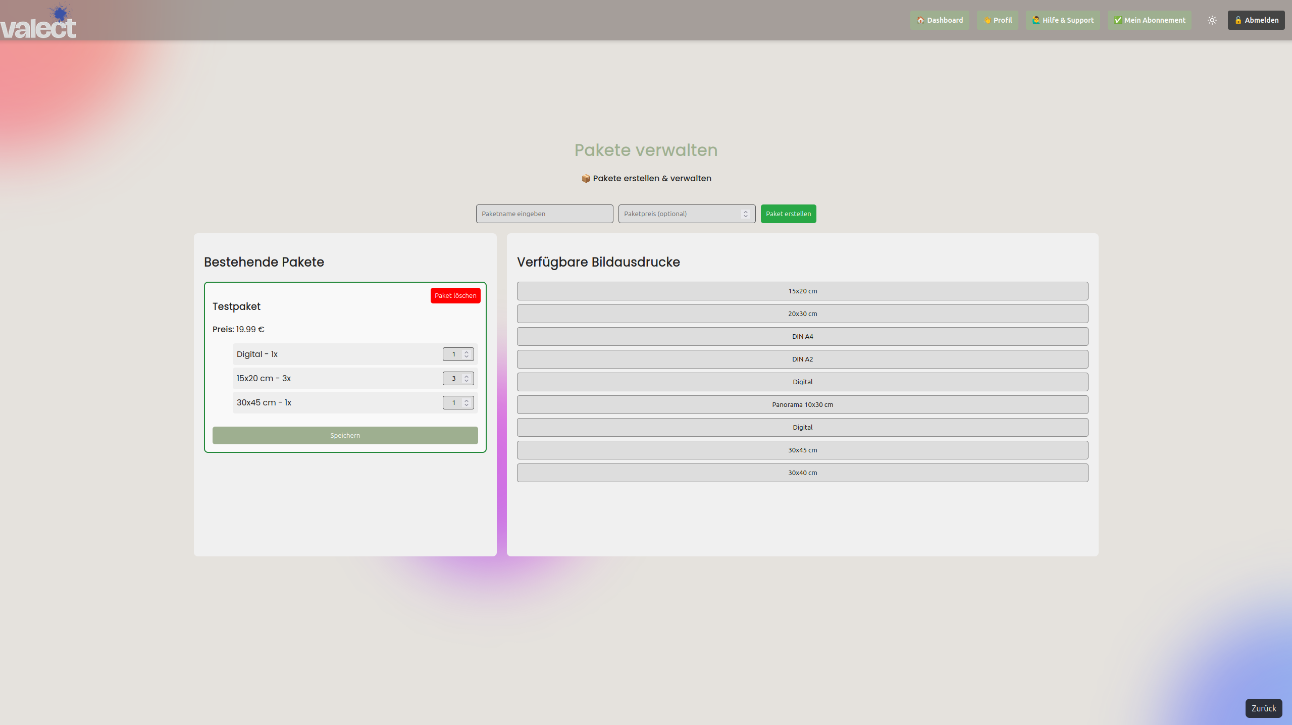 sowie das Erstellen von Paketen mit festgelegten Bildmengen und Formatkombinationen zu deinen Preisen.